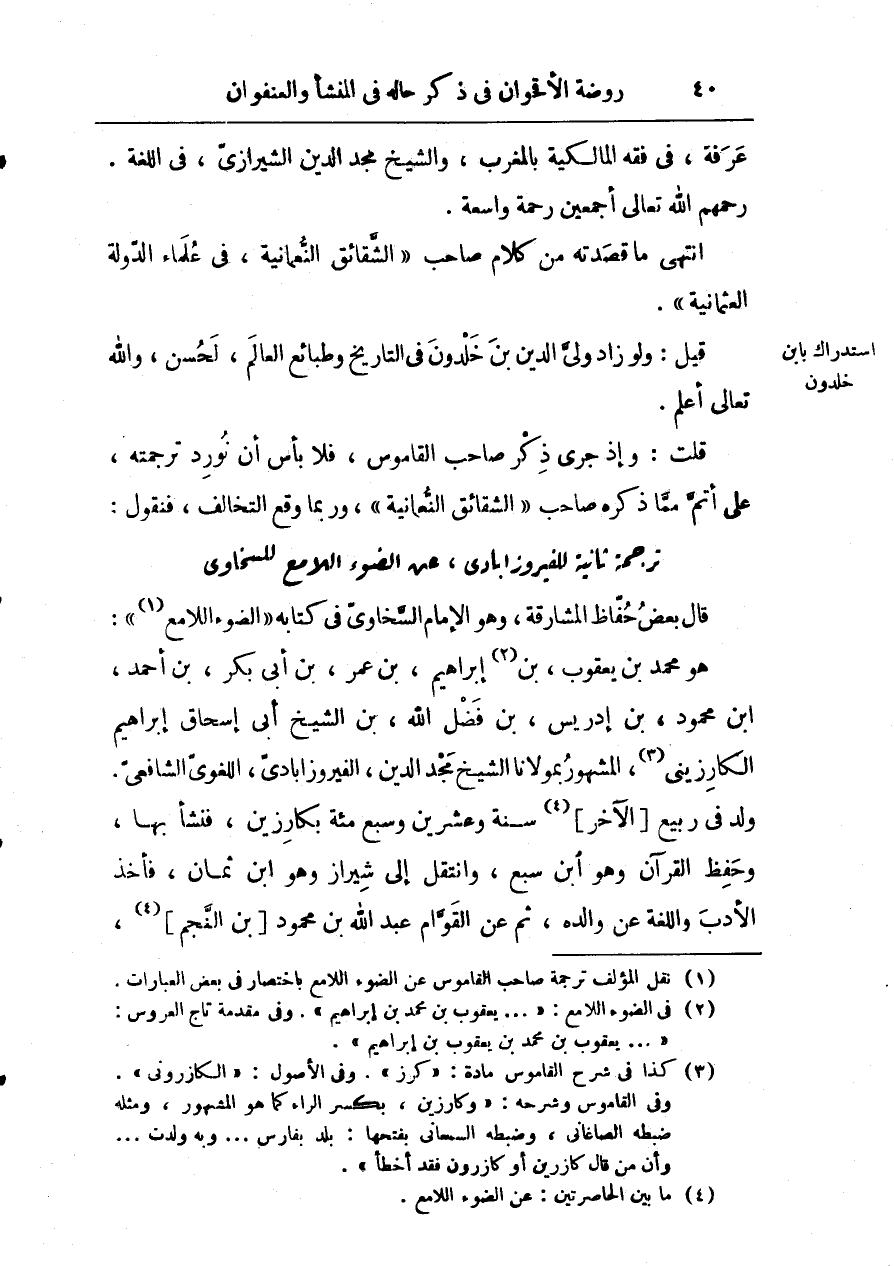 قلت: وإذ جرى ذكر صاحب القاموس، فلا بأس أن نورد ترجمته، على أتم مما ذكره صاحب " الشقائق النعمانية " وربما وقع التخالف، فنقول: