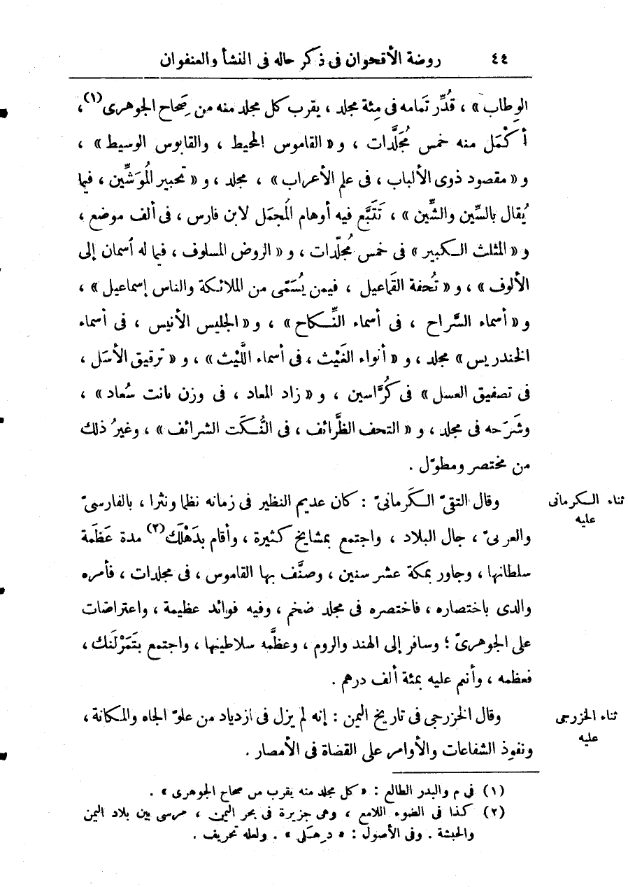 وقال التقي الكرماني: كان عديم النظير في زمانه نظما ونثرا بالفارسي والعربي جال البلاد واجتمع بمشايخ كثيرة وأقام بدهلك مدة عظمة سلطانها وجاور بمكة عشرين سنة وصنف بها القاموس في مجلدات فأمره والدي باختصاره فاختصره في مجلد ضخم وفيه فوائد عظيمة واعتراضات على الجوهري وسافر إلى الهند والروم وعظمة سلاطينها واجتمع بتمرلنك فعظمه وأنعم عليه بمائة ألف درهم.