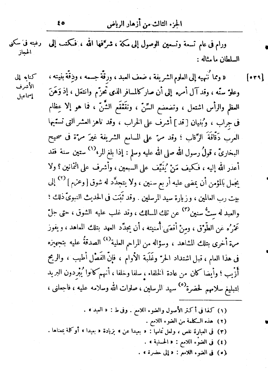 " ومما ننهيه إلى العلوم الشريفة ضعف العبد ورقدة جسمه ودقة بنيته وعلو سنه وقد آل إلى أن صار كالمسافر الذي تحزم وانتعل إذ وهن العظم والرأس اشتعال وتضعضع السن وتقعقع الشن فما هو إلاّ عظام في جراب وبنيان قد أشرف على الخراب ود ناهز العشرة التي تسميها العرب دقائق الرقاب وقد مر على المسامع الشريفة غير مرة في صحيح البخاري قولهم: رسول الله صلى الله عليه وسلم: إذا بلغ المرء ستين سنة فقد أعذر الله إليه فكيف من ينيف على السبعين وأشرف على الثمانين؟ ولا يجمل بالمؤمن أن يمضي علليه أربع سنين ولا يتجدد له سوق وعزم إلى بيت رب العالمين وزيارة سيد المرسلين. وقد ثبت في الحديث النبوي ذلك والعبد له ست سنين عن تلك المسالك وقد غلب عليه الشوق حتى جل عمره عن الطوق ومن أقضى أمنيته أن يجدد العهد بتلك المعاهد ويفوز مرة أخرى بتلك المشاهد وسؤاله من المراحم العلية الصدقة عليه بتجهيزه في هذا العام قبل اشتداد الحر وغلبة الأوام فإن الفصل أطيب والريح أزيب وأيضاً كان من عادة الخلفاء سلفا وخلفا أنهم كانوا يبردون البريد لتبليغ سلامهم لحضرة سيد المرسلين صلى الله عليه وسلم فاجعلني