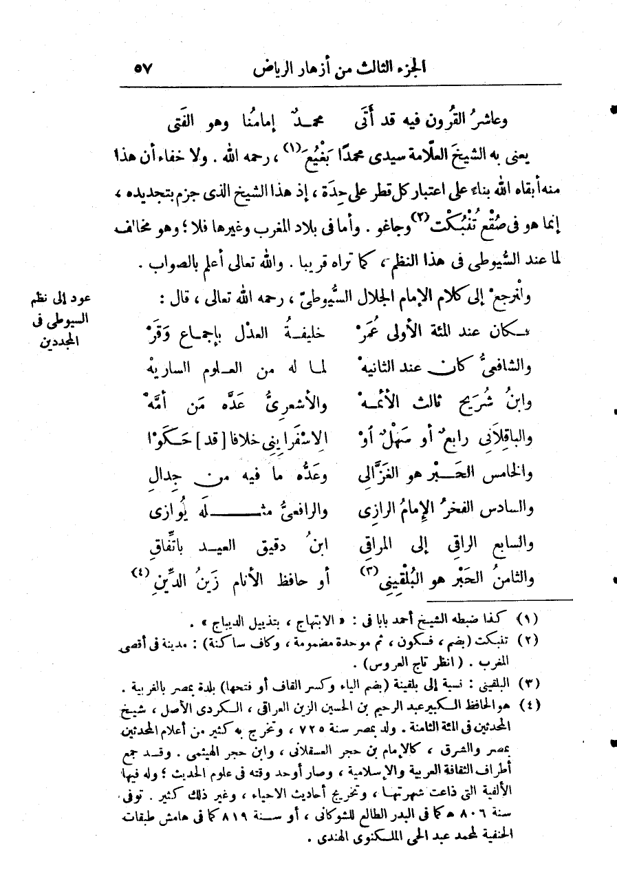 يعني به الشيخ العلامة سيدي محمّد بغيع رحمه الله. ولا خفاء أنَّ هذا منه أبقاه الله بناء على اعتبار كل قطر على حدة إذ هذا الشيخ الذي جزم بتجديده إنما هو في صقع تنبكت جاغو. وأما بلاد المغرب وغيرها فلا وهو مخالف لمّا عند السيوطي في هذا النظم كما تراه قريبا والله تعالى أعلم بالصواب.