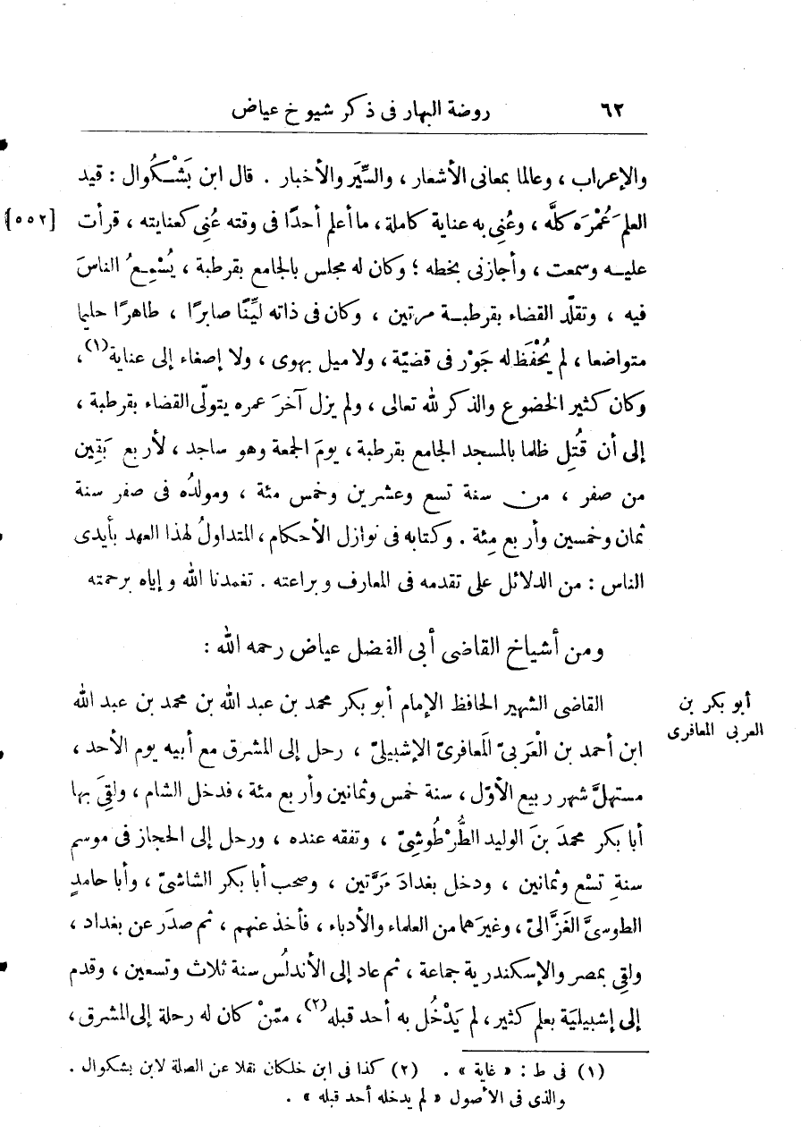 القاضي الشهير الحافظ الإمام أبو بكر محمّد بن عبد الله بن محمّد بن عبد الله ابن أحمد بن العربي المعافري الأشبيلي، رحل إلى المشرق مع أبيه يوم الأحد، مستهل شهر ربيع الأول سنة خمس وثمانين وأربع مائة، فدخل الشام، ولقي بها أبا بكر محمّد بن الوليد الطرطوشي، وتفقه عنده، ورحل إلى الحجاز في موسم سنة نسع وثمانين، ودخل بغداد مرتين، وصحب أبا بكر الشاشي، وأبا حامد الطوسي الغزالي، وغيرهما من العلماء والأدباء، فأخذ عنهم، ثم صدر عن بغداد، ولقي بمصر والأسكندرية جماعة، ثم عاد إلى الأندلس سنة ثلاث وتسعين، وقدم إلى إشبيلية بعلم كثير، لم يدخل به أحد قبله، ممن كان له رحلة إلى المشرق،