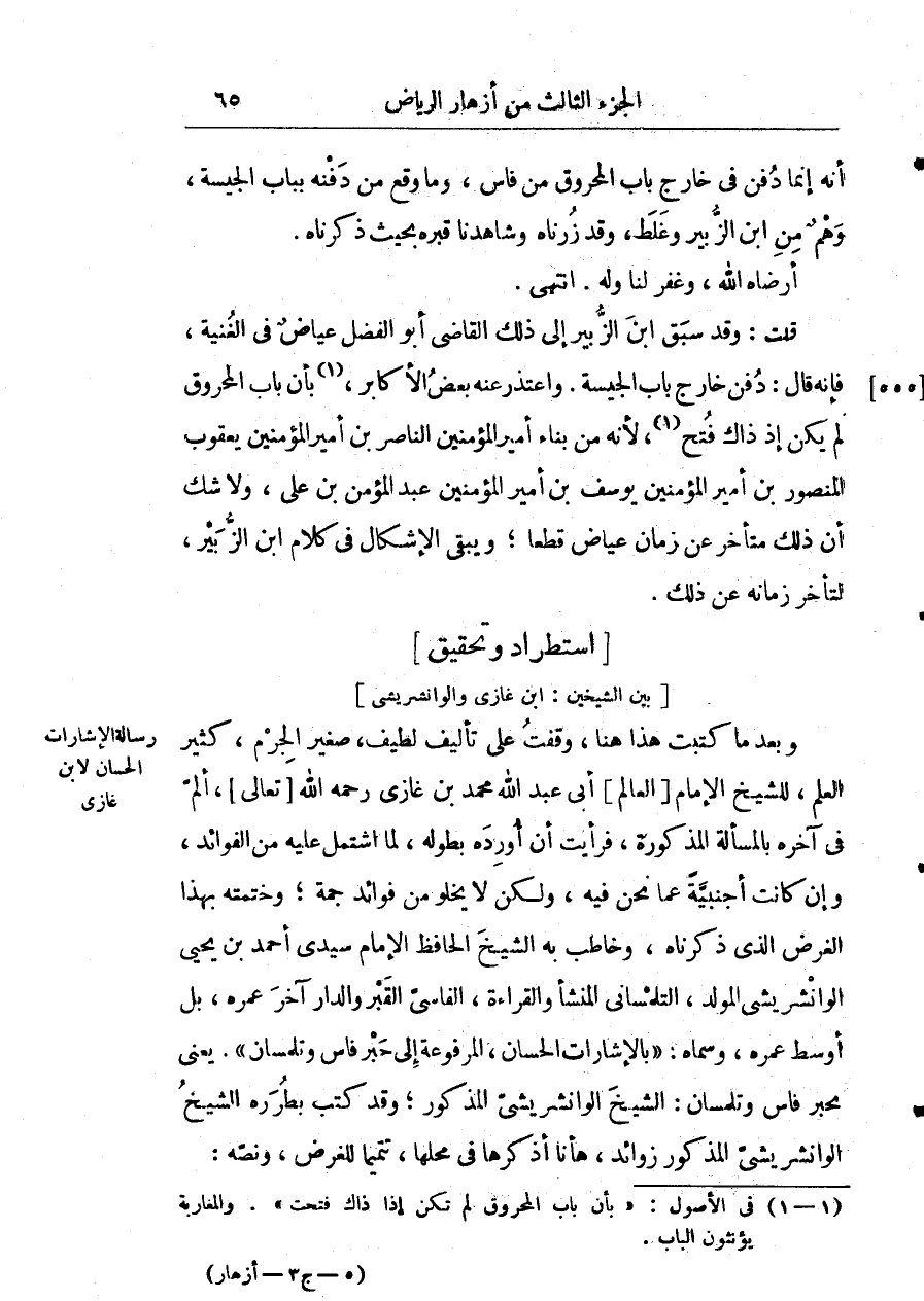 بين الشيخين: ابن غازي والوانشريشي وبع ما كتبت هذا هنا، وقفت على تأليف لطيف صغير الجرم، مثير العلم للشيخ الإمام العالم أبي عبد الله محمّد بن غازي رحمه الله تعالى ألم في آخره بالمسألة المذكورة، فرأيت أنْ أورده بطوله، لمّا اشتمل عليه من الفوائد، وإنْ كانت أجنبيه عما نحن فيه، ولكن لا يخلو من فوائد جمة، وختمته بهذا الغرض الذي ذكرتناه، وخاطب به الشيخ الحافظ الإمام سيدي أحمد بن يحيى الوانشريشي الملد، التلمساني المنشأ والقراءة، الفاسي القبر والدار آخر عمره، بل أوسط عمره، وسماه: " بالإشارات الحسان، المرفوعة إلى حبر فاس وتلمسان " يعني بحبر فاس وتلمسان: الشيخ الوانشريشي المذكور؛ وقد كتب بطرره الشيخ الوانشريشي المذكور زوائد، هاأنا أذكرها في محلها، تتميماً للغرض، ونصه: