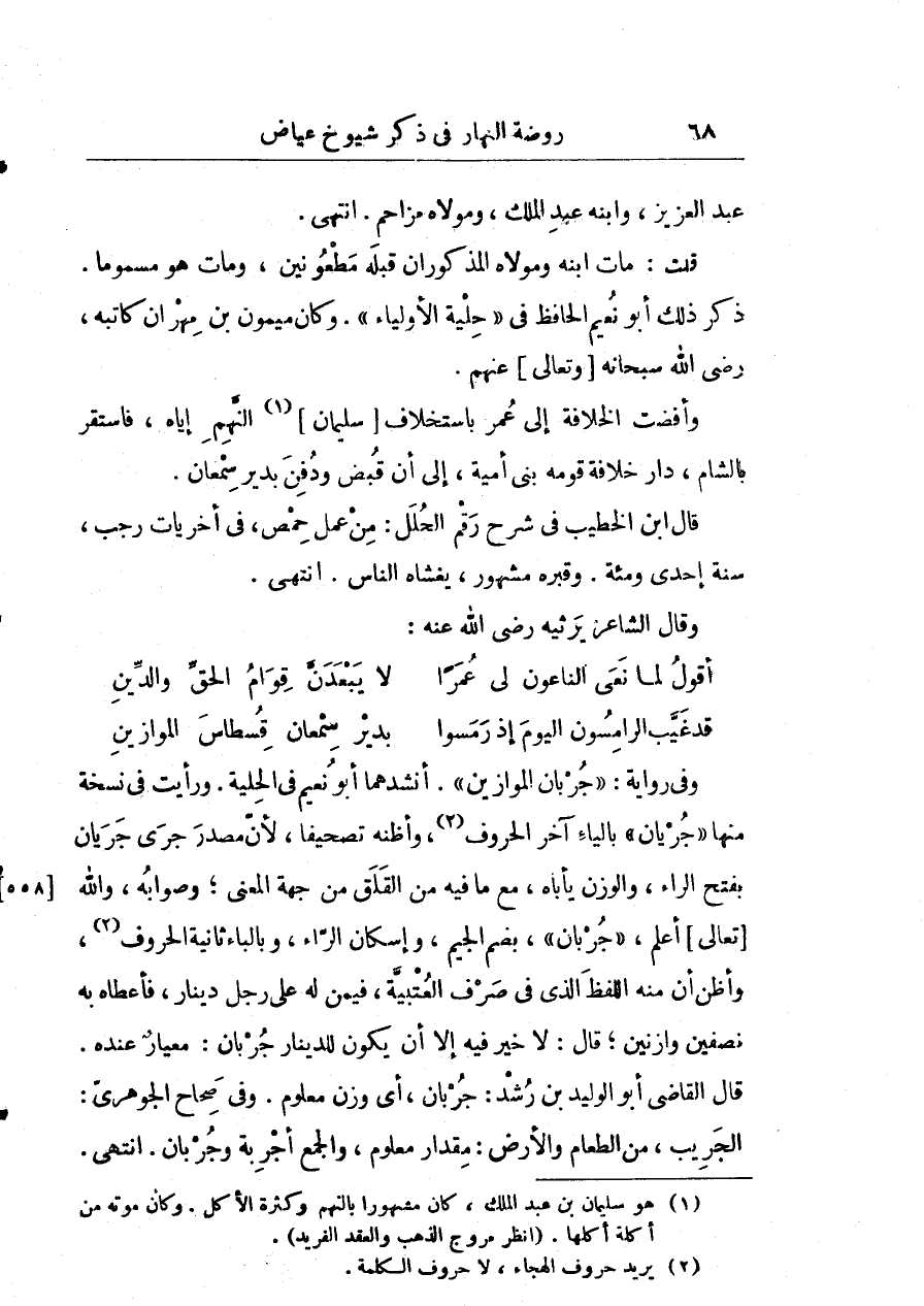 وفي رواية " جبران الموازين ". أنشدهما أبو نعيم في حلية. ورأيت في نسخة منها جريان بالياء آخر الحرف وأظنه تصحيفا لأن مصدر جريان جري جريان بفتح الراء والوزن يأباه مع ما فيه من القلق من جهة المعنى وصوابه والله تعالى اعلم جربان بضم الجيم وإسكان الراء وبالباء ثانية الحروف وأظن أنَّ منه اللفظ الذي في صرف العتيبة فيمن له على رجل دينار فأعطاه به نصفين وازنين قال: لا خير فيه إلاّ أنْ يكون للدينار جربان: كعيار عنده. قال اللقاضي أبو الوليد بن رشد: جربان أي وزن معلوم. وفي صحاح الجوهري: الجريب من الطعام والأرض: ممقدار معلوم والجمع أجربة وجربان. انتهى.