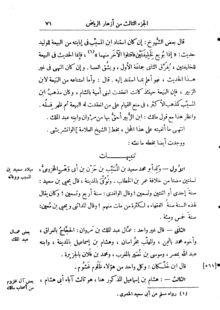 قال بعض الشيوخ: إنْ كان استناد ابن المسيب في إبايته من البيعة للوليد حديث: " إذا بويع لخليفتين فاقتلوا الآخر منهما "، فإنما الحديث في البيعة للخليفتين، يفرق الثاني جماعة الأمل، ويشق العصا. وإنْ كان النهي في غير هذا الحديث، فهو أعلم بما استند إليه، قال: وأما امتناعه من البيعة لابن الزبير، فإنَّ البيعة حينئذ كانت انعقدت لبني امية في الشام، وكان مذهب ابن المسيب كمذهب الأكثر، في منع القيام على من انعقدت له البيعة ثم ظهر فسقه. وانظر هذا مع قول مالك: ابن الزبير أحق بها من مروان وابنه عبد الملك.