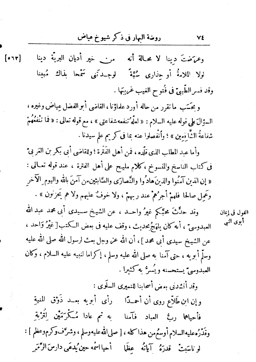 وأما عبد المطلب الذي قلده من أهل الفترة وللقاضي أبي بكر بن العربي في كتاب الناسخ والمنسوخ كلام مليح على أهل الفترة عند قوله تعالى:) إنَّ الذين آمنوا والذين هادوا والنصارى والصابئين من آمن بالله واليوم الآخر وعمل صالحا فلهم أجرهم عند ربهم ولا خوف عيهم ولا هم يحزنون (.
