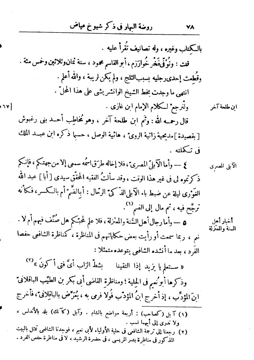 4 - وأما الآبلي المصري فلا إخالة طرق اسمه سمعي إلاّ من جهتكم فإنكم ذكرتموه لي في غير هذا الوقت وقد سألت الفقيه المحقق سيدي أبا عبد الله الغوري ليلة عن ضبط باء الآبلي الذكي الرحال: أبالضم أو بالكسر فكأنه ترجح فيه ثم مال إلى الضم.