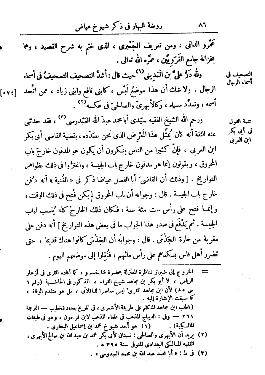 ورحم الله الفقيه الشيخ سيدي أبا محمّد عبد الله العبدوسي فقد حدثني عنه التقة أنَّه كان يمثل هذا المعرض الذي نحن بصدده بقضية القاضي أبي بكر ابن العربي فإن كثيرا من الناس ينكرون أنْ يكون هو المدفون خارج باب المحروق ويقولون إنما هو مدفون خارج باب الجيسة واغتروا في ذلك بظواهر التواريخ. وذلك أنْ القاضي أبا الفضل عياض ذكر في الغنية أنه دفن خارج باب الجيسة قال: وجوابه أنَّ باب المحروق لم يكن فتح في ذلك الوقت وإنما فتح على رأس ست مائة سنة فكان ذلك الخارج كله ينسب لباب الجيسة ثم يدفع في صدر هذا الجواب ما في بعض هذه التواريخ أنه دفن على مقربة من حارة الجذامي. قال: وجوابه أنَّ الجذامي كانوا هناك قديما حتى تضرر أهل فاس بسكناهم على رأس مائهم فنقلوا إلى موضعهم اليوم.