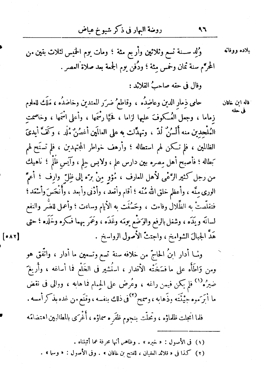 ولد سنة تسع وثلاثين وأربع مائة؛ ومات يوم الخميس لثلاث بقين من المحرم سنة ثمان وخمس مائة؛ ودفن يوم الجمعة بعد صلاة العصر: وقال في حقه صاحب القلائد: حامي ذمار الدين وعاضده، وقاطع ضرر المعتدين وخاضده، ملك للعلوم زماماً، وجعل العكوف عليها لزاما، فحيا رسمها، وأعلى اسمها، وخاصمت الملحدين منه ألسن لد، وتهدلت به على العالمين أغصن ملد، وكف أيدي الظالمين، فلم تكن لهم استطالة؛ وأرهف خواطر المجتهدين، فلم تسنح لهم بطالة؛ فأصبح أهل مصره بين دارس علم، ولابس حلم، وآيس ظلم؛ ناهيك من رجل كثير الرعى لأهل المعارف، مؤو من بره إلى ظل وارف؛ أعم الورى منه، وأعظم خلق الله منه؛ وأقام وأدنى وأبعد، وأنحس وأسعد؛ فتقلصت به الظلال وفاءت، وحسنت به الأيام وساءت؛ واعمل للضرر والنفع لسانه ويده، وشغل بالرفع والوضع يومه وغده، وعمر بهما فكره وخلده؛ حتى هد الجبال الشوامخ، واجتث الأصول الرواسخ.