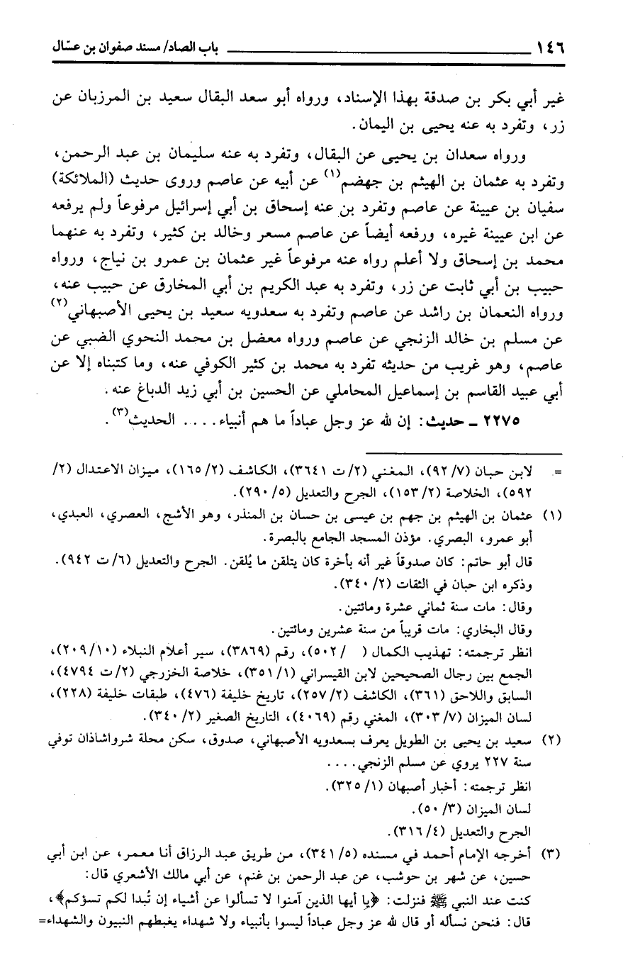 وَرَوَاهُ سَعْدَان بن يحيى عَن الْبَقَّال، وَتفرد بِهِ عَنهُ سُلَيْمَان بن عبد الرَّحْمَن، وَتفرد بِهِ عُثْمَان بن الْهَيْثَم بن جَهْضَم عَن أَبِيه عَن عَاصِم وروى حَدِيث (الْمَلَائِكَة) سُفْيَان بن عُيَيْنَة عَن عَاصِم وَتفرد بن عَنهُ إِسْحَاق بن أبي إِسْرَائِيل مَرْفُوعا وَلم يرفعهُ عَن ابْن عُيَيْنَة غَيره، وَرَفعه أَيْضا عَن عَاصِم مسعر وخَالِد بن كثير، وَتفرد بِهِ عَنْهُمَا مُحَمَّد بن إِسْحَاق وَلَا أعلم رَوَاهُ عَنهُ مَرْفُوعا غير عُثْمَان بن عَمْرو بن نياج، وَرَوَاهُ حبيب بن أبي ثَابت عَن زر، وَتفرد بِهِ عبد الْكَرِيم بن أبي الْمخَارِق عَن حبيب عَنهُ، وَرَوَاهُ النُّعْمَان بن رَاشد عَن عَاصِم وَتفرد بِهِ سَعْدَوَيْه سعيد بن يحيى الْأَصْبَهَانِيّ عَن مُسلم بن خَالِد الزنْجِي عَن عَاصِم وَرَوَاهُ معضل بن مُحَمَّد النَّحْوِيّ الضَّبِّيّ عَن عَاصِم، وَهُوَ غَرِيب من حَدِيثه تفرد بِهِ مُحَمَّد بن كثير الْكُوفِي عَنهُ، وَمَا كتبناه إِلَّا عَن أبي عبيد الْقَاسِم بن إِسْمَاعِيل الْمحَامِلِي عَن الْحُسَيْن بن أبي زيد الدّباغ عَنهُ.