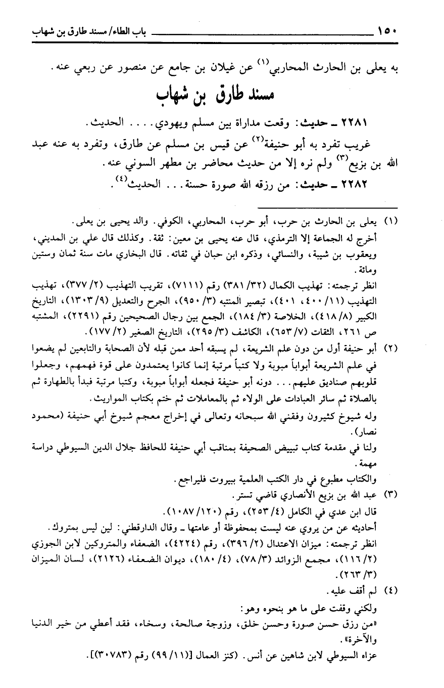 غَرِيب تفرد بِهِ أَبُو حنيفَة عَن قيس بن مُسلم عَن طَارق، وَتفرد بِهِ عَنهُ عبد الله بن بزيع وَلم نره إِلَّا من حَدِيث محَاضِر بن مطهر السوني عَنهُ.