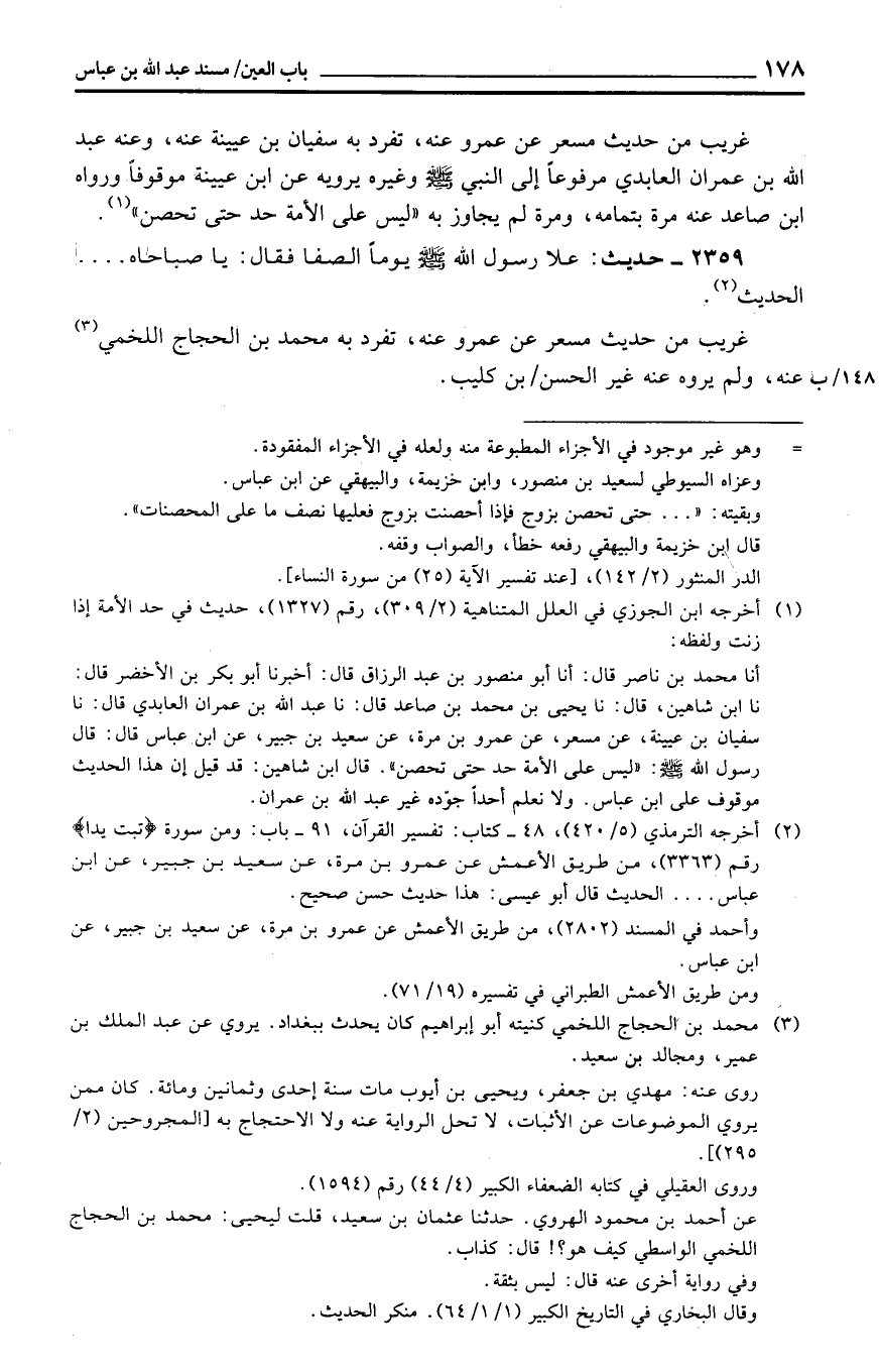 غَرِيب من حَدِيث مسعر عَن عَمْرو عَنهُ، تفرد بِهِ سُفْيَان بن عُيَيْنَة عَنهُ، وَعنهُ عبد الله بن عمرَان العابدي مَرْفُوعا إِلَى النَّبِي وَغَيره يرويهِ عَن ابْن عُيَيْنَة مَوْقُوفا وَرَوَاهُ ابْن صاعد عَنهُ مرّة بِتَمَامِهِ، وَمرَّة لم يُجَاوز بِهِ (لَيْسَ على الْأمة حد حَتَّى تحصن) .