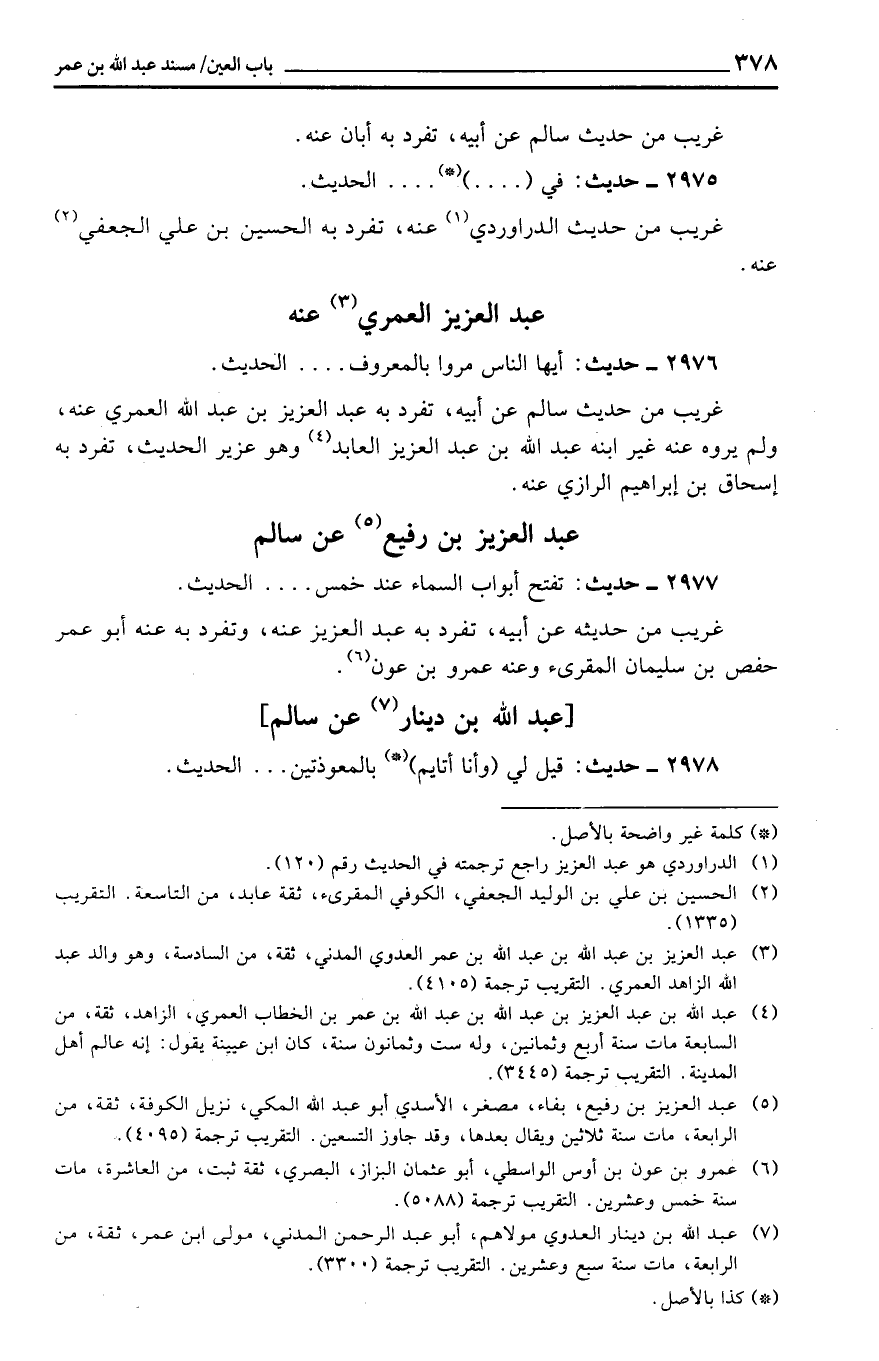 غَرِيب من حَدِيث سَالم عَن أَبِيه، تفرد بِهِ عبد الْعَزِيز بن عبد الله الْعمريّ عَنهُ، وَلم يروه عَنهُ غير ابْنه عبد الله بن عبد الْعَزِيز العابد وَهُوَ عُزَيْر الحَدِيث، تفرد بِهِ إِسْحَاق بن إِبْرَاهِيم الرَّازِيّ عَنهُ.