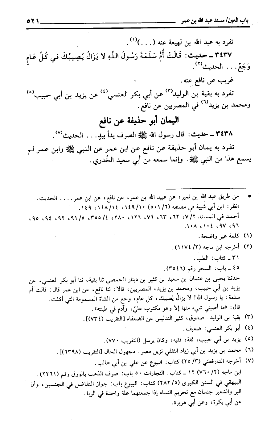 تفرد بِهِ بَقِيَّة بن الْوَلِيد عَن أبي بكر الْعَنسِي عَن يزِيد بن أبي حبيب وَمُحَمّد بن يزِيد فِي المصريين عَن نَافِع.