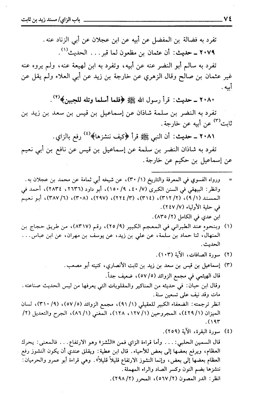 تفرد بِهِ سَالم أَبُو النَّضر عَنهُ عَن أَبِيه، وَتفرد بِهِ ابْن لَهِيعَة عَنهُ، وَلم يروه عَنهُ غير عُثْمَان بن صَالح وَقَالَ الزُّهْرِيّ عَن خَارِجَة بن زيد عَن أبي الْعَلَاء وَلم يقل عَن أَبِيه.