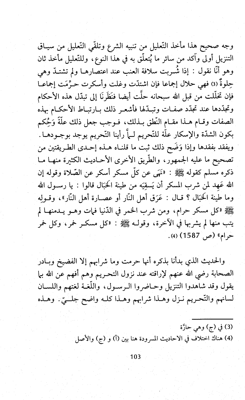 وجه صحيح هذا مأخذ التّعليل من تنبيه الشرع وتلقّي التّعليل من سياق التنزيل أولى وآكد من سائر ما يُتعلّق به في هذا النوع، وللتّعليل مأخذ ثان وهو أنّا نقول: إذا شُربت سلافة العنب عند اعتصارها ولم تشتدّ وهي حِلوهٌ (¬3) فهي حلال إجماعا فإن اشتدّت وغلت وأسكرت حرِّمَت إجماعا فإن تخلّلت من قبل الله سبحانه حلَّت أيضاً فنَظَرنَا إلى تبدّل هذه الأحكام وتجدّدها عند تجدّد صفات وتبدّلها فاشعر ذلك بارتباط الأحكام بهذه الصفات وقام هذا مقام النّطق بذلك، فوجب جعل ذلك علّةً وَحُكم يكون الشدّة والإسكار علّة للتّحريم لماَّ رأينا التّحريم يوجد بوجودها. ويفقد بفقدها وإذا وَضَح ذلك ثبت ما قلناه هذه إحدى الطريقتين من تصحيح ما عليه الجمهور، والطّريق الأخرى الأحاديث الكثيرة منها ما ذكره مسلم كقوله - صلى الله عليه وسلم -: "نَهَى عن كلّ مسكر أسكر عن الصّلاة وقوله إن الله عَهِد لمن شرب المسكر أن يَسقِيَه من طينة الخبَال قالوا: يا رسول الله وما طينة الَخبَال؟ قال: عَرَق أهل النّار أو عصارة أهل النّار"، وقولِه - صلى الله عليه وسلم - "كل مسكر حرام، ومن شرب الخمر في الدّنيا فمات وهو يدمنها لم يتب منها لم يشربها في الآخرة، وقوله - صلى الله عليه وسلم -: "كل مسكر خمر، وكل خمر حرام" (ص 1587) (¬4).