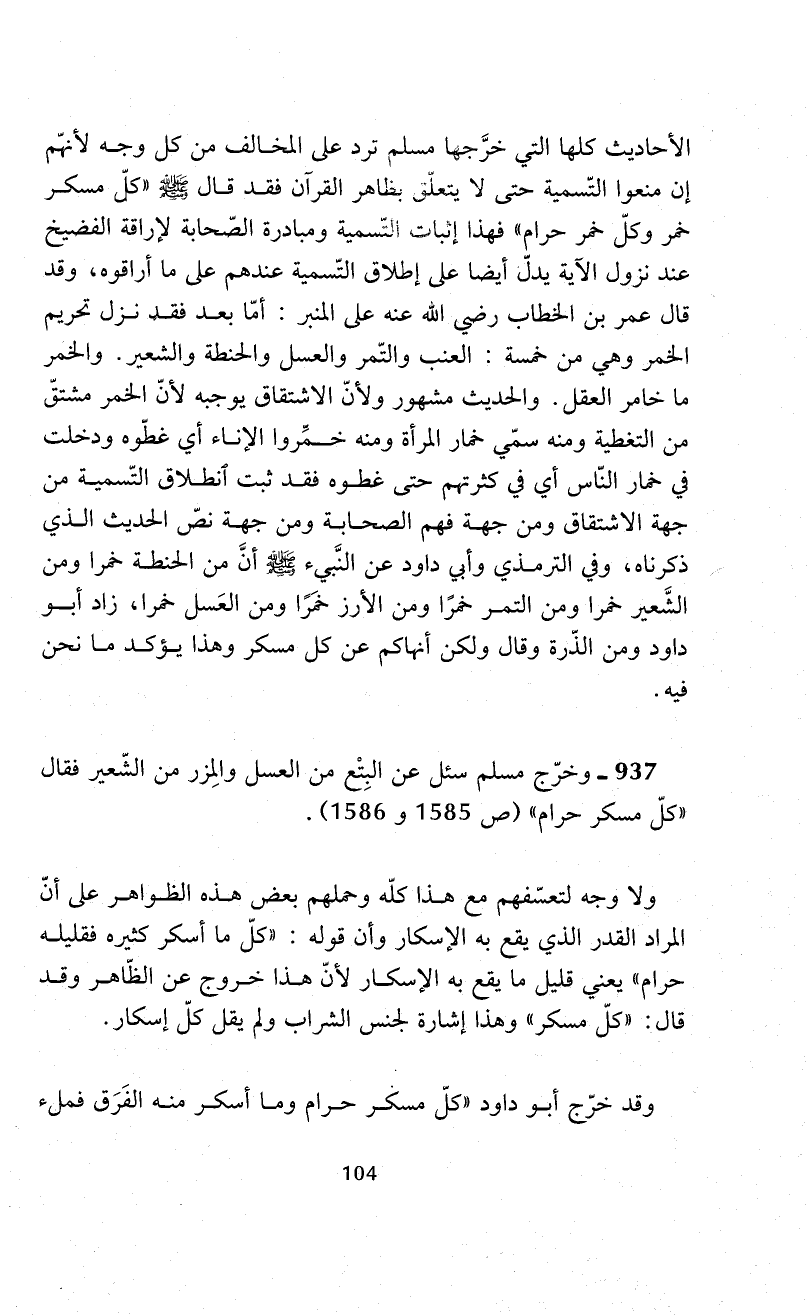 937 - وخرّج مسلم سئل عن البِتعْ من العسل والِمزر من الشّعير فقال "كلّ مسكر حرام" (ص 1585 و 1586).