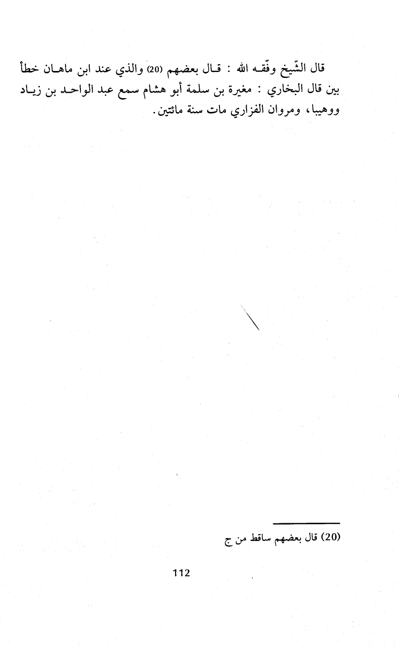 قال الشّيخ وفّقه الله: قال بعضهم (¬20) والذي عند ابن ماهان خطأ بين قال البخاري: مغيرة بن سلمة أبو هشام سمع عبد الواحد بن زياد ووهيبا، ومروان الفزاري مات سنة مائتين.
