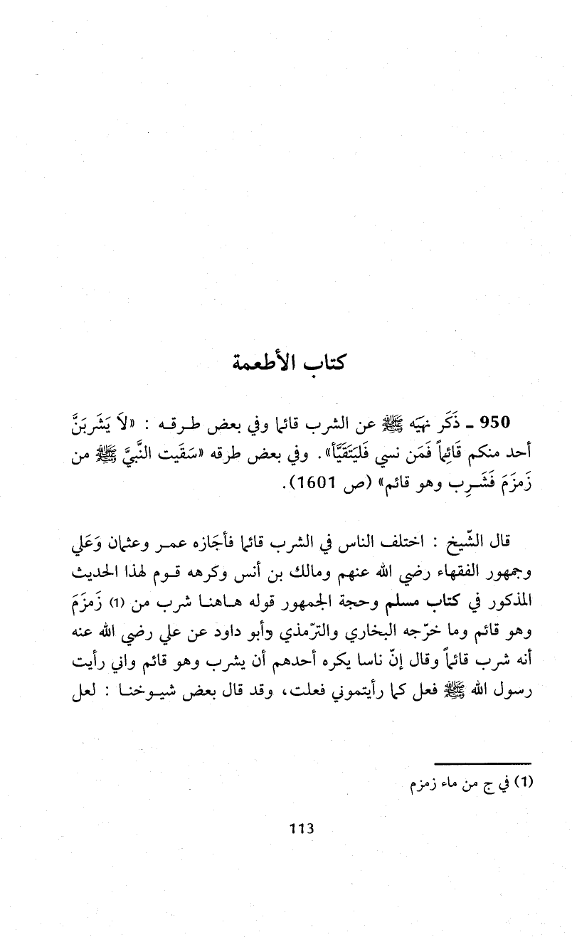 950 - ذَكَر نَهيَه - صلى الله عليه وسلم - عن الشرب قائما وفي بعض طرقه: "لاَ يَشَربَنَّ أحد منكم قَائِماً فَمَن نسي فَليَتَقَيَّأ". وفي بعض طرقه "سَقَيت النَّبيَّ - صلى الله عليه وسلم - من زَمزَمَ فَشَرِب وهو قائم" (ص 1601).