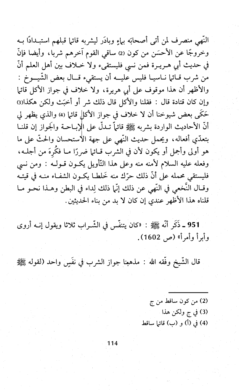 951 - ذَكَر أنّه - صلى الله عليه وسلم -: "كان يتنفّس في الشّراب ثلاثاً ويقول إنه أروى وأبرأ وأمرأ" (ص 1602).