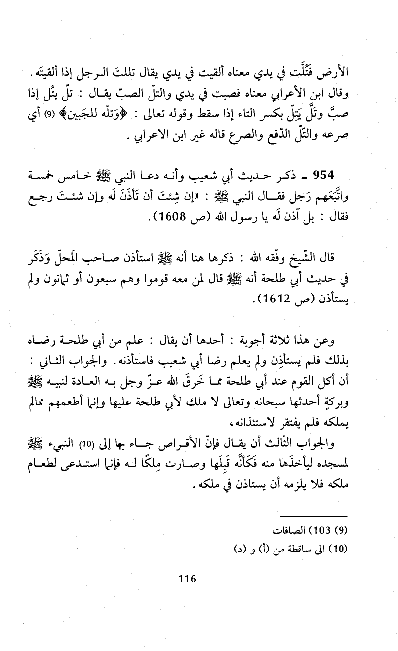 قال الشّيخ وفّقه الله: ذكرها هنا أنه - صلى الله عليه وسلم - استأذن صاحب الَمحلّ وَذَكَر في حديث أبي طلحة أنه - صلى الله عليه وسلم - قال لمن معه قوموا وهم سبعون أو ثمانون ولم يستأذن (ص 1612).