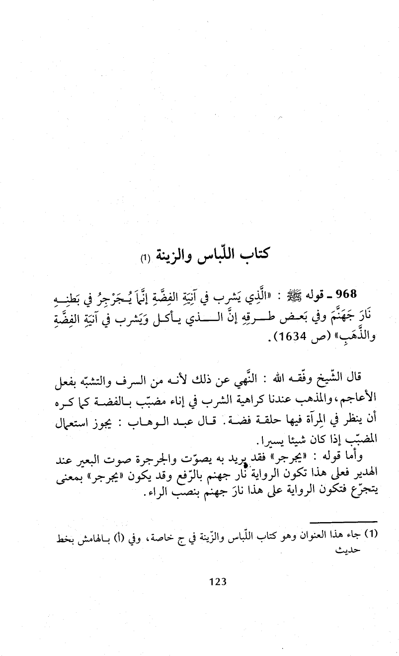 968 - قوله - صلى الله عليه وسلم -: "الَّذِي يَشرب في آنِيَةِ الفِضَّةِ إنَّماَ يُجَرْجِرُ في بَطنِهِ نَارَ جَهَنَّمَ وفي بَعض طرقِهِ إنَّ الذي يأكل وَيَشرب في آنيَةِ الفِضَّةِ والذّهَبِ" (ص 1634).