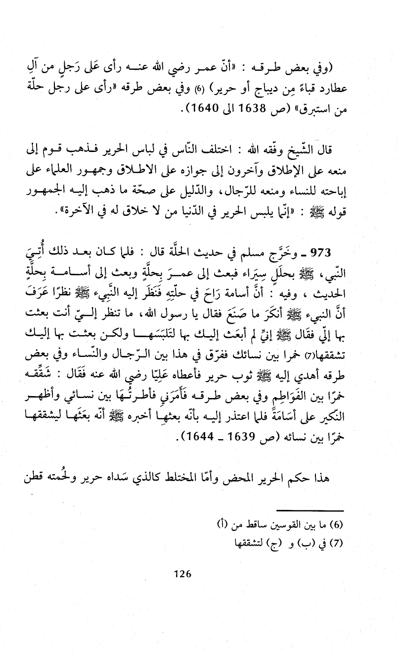 (وفي بعض طرقه: "أنّ عمر -رضي الله عنه- رأى عَلى رَجلٍ من آلِ عطارد قباءً مِن ديباج أو حرير) (¬6) وفي بعض طرقه "رأى على رجل حلّة من استبرق" (ص 1638 إلى 1640).