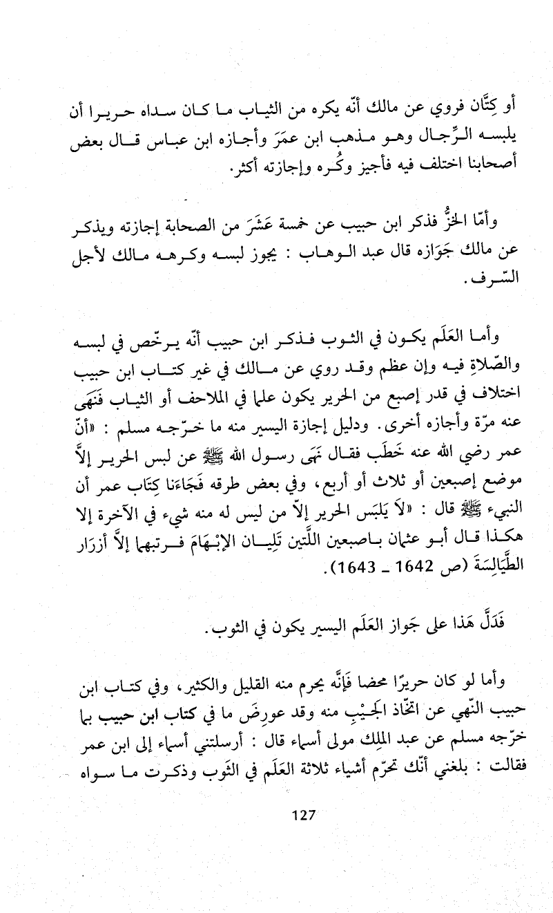 وأما العَلَم يكون في الثوب فذكر ابن حبيب أنّه يرخّص في لبسه والصّلاةِ فيه وإن عظم وقد روي عن مالك في غير كتاب ابن حبيب اختلاف في قدر إصبع من الحرير يكون علماً في الملاحف أو الثياب فَنَهى عنه مرّة وأجازه أخرى. ودليل إجازة اليسير منه ما خرّجه مسلم: "أنّ عمر -رضي الله عنه- خَطَب فقال نَهَى رسول الله - صلى الله عليه وسلم - عن لبس الحرير إلاَّ موضع إصبعين أو ثلاث أو أربع، وفي بعض طرقه فَجَاءَنا كِتَاب عمر أن النبيء - صلى الله عليه وسلم - قال: "لاَ يَلبَس الحرير إلاّ من ليس له منه شيء في الآخرة إلا هكذا قال أبو عثمان باصبعين اللَّتين تَلِيان الإبْهَامَ فرتبهما إلاَّ أزرَار الطَّيَالِسَةَ (ص 1642 - 1643).
