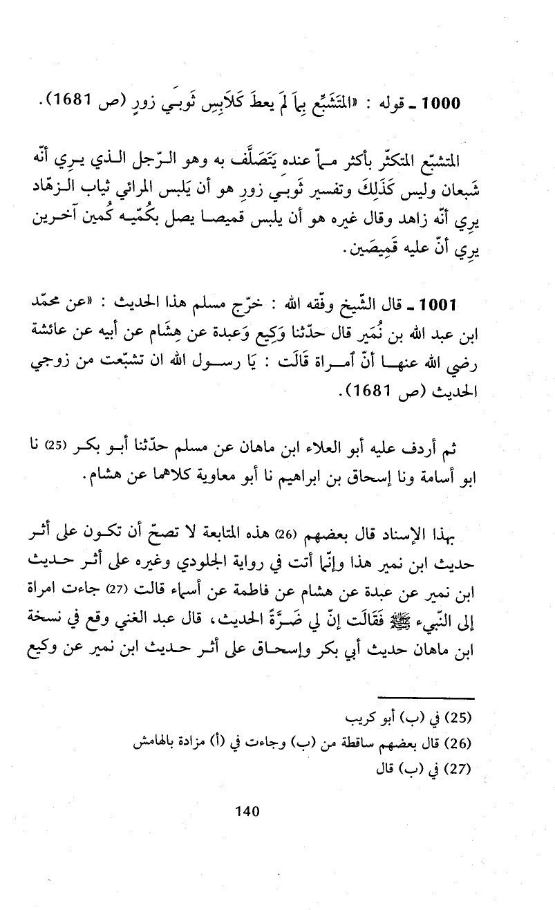 1001 - قال الشّيخ وفّقه الله: خرّج مسلم هذا الحديث: "عن محمّد ابن عبد الله بن نُمَير قال حدّثنا وَكِيع وَعبدة عن هِشَام عن أبيه عن عائشة -رضي الله عنها- أنّ امراة قَالَت: يَا رسول الله إن تشبّعت من زوجي الحديث (ص 1681).