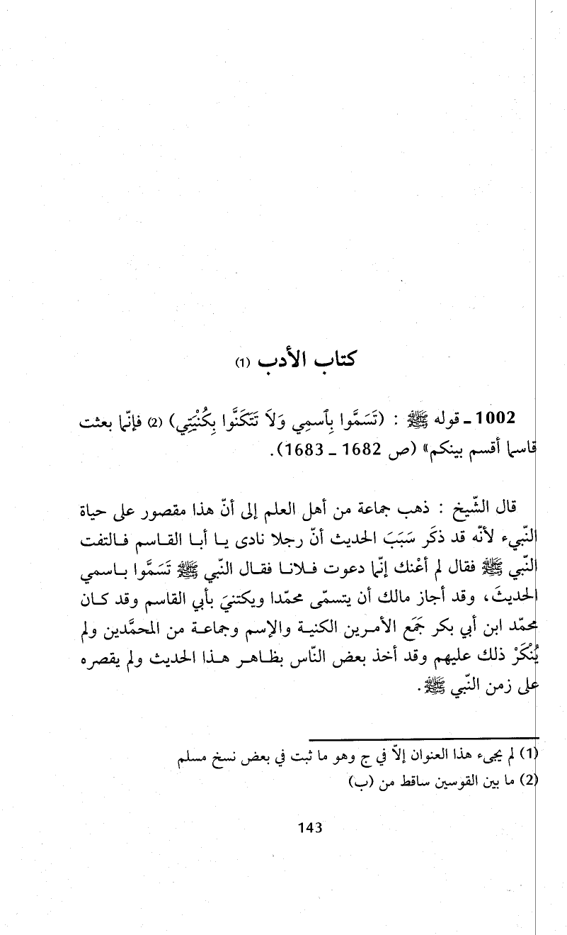 1002 - قوله - صلى الله عليه وسلم -: (تَسَمَّوا بِاسمِي وَلاَ تَتَكَنَّوا بِكُنْيَتي) (¬2) فإنّما بعثت قاسما أقسم بينكم" (ص 1682 - 1683).