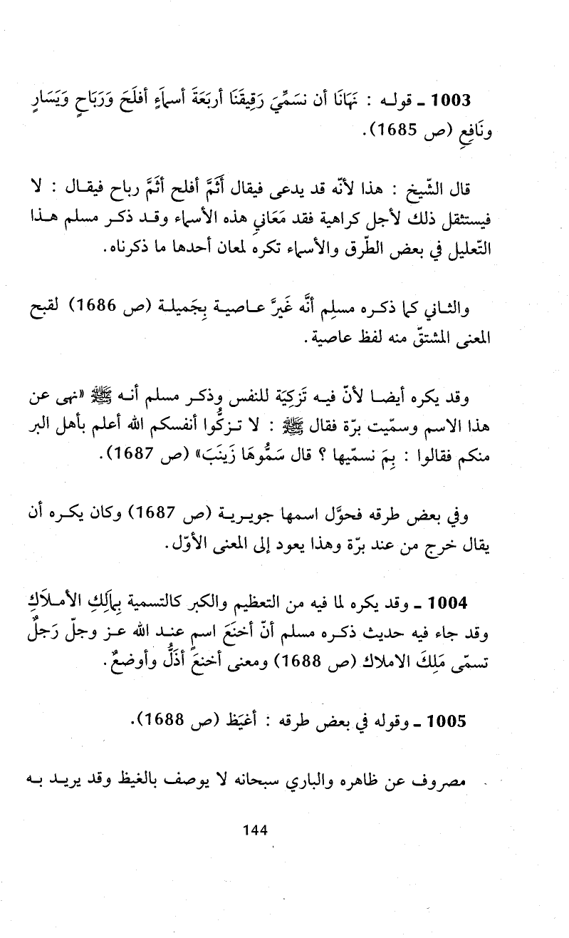 1003 - قوله: نَهَانَا أن نسَمِّيَ رَقِيقَنَا أربَعَةَ أسماَءٍ أفلَحَ وَرَبَاحٍ وَيَسَارٍ ونَافِعِ (ص 1685).