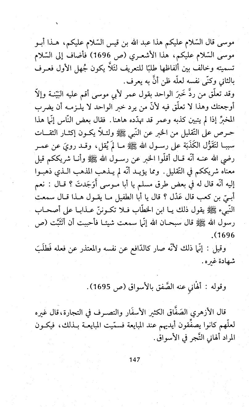 موسى قال السّلام عليكم هذا عبد الله بن قيس السّلام عليكم، هذا أبو موسى السّلام عليكم، هذا الأشعري (ص 1696) فأضاف إلى السّلام تسميته وخالف بين ألفاظها طلبًا للتعريف لئَلاَّ يكون جُهل الأول فعرف بالثاني وكنّى نفسه لعلّه ظن أنَّ به يعرف.