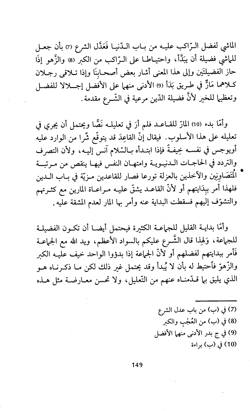الماشي لفضل الرّاكب عليه من باب الدّنيا فَعَدَّل الشرع (¬7) بأن جعل للماشي فضيلة أن يبَدَّأ، واحتياطا على الرّاكب من الكبر (¬8) والزَّهو إذَا حاز الفضيلتَين وإلى هذا المعنى أشار بعض أصحابِنَا وإذا تلاقى رجلان كلاهما مَارٌّ في طريق بَدَأ (¬9) الأدنى منهما على الأفضل إجلالا للفضل وتعظيما للخير لأنَّ فضيلة الدّين مرعية في الشّرع مقدمة.