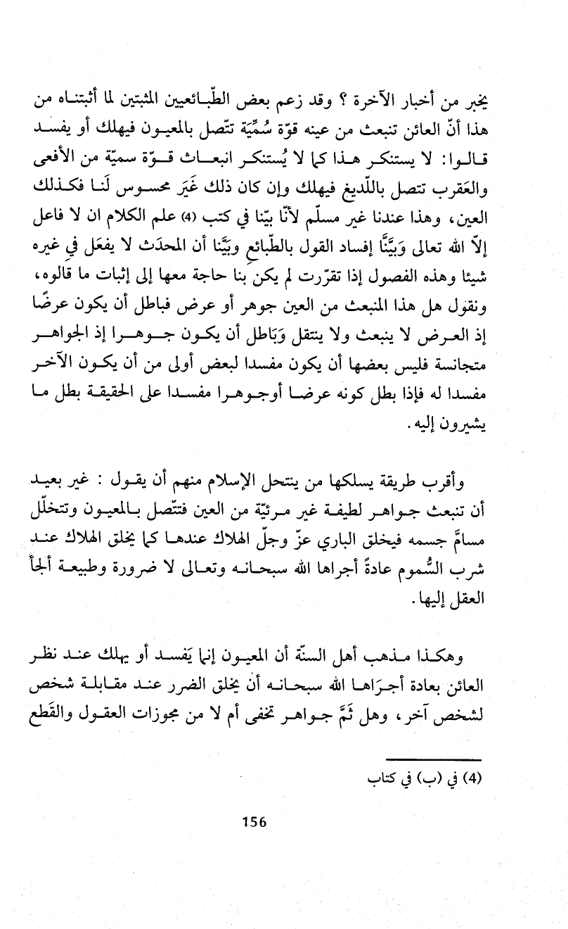 وأقرب طريقة يسلكها من ينتحل الإسلام منهم أن يقول: غير بعيد أن تنبعث جواهر لطيفة غير مرئيّة من العين فتتّصل بالمعيون وتتخلّل مسامَّ جسمه فيخلق الباري عزّ وجلّ الهلاك عندها كما يخلق الهلاك عند شرب السُّموم عادةً أجراها الله سبحانه وتعالى لا ضرورة وطبيعة ألجأ العقل إليها.