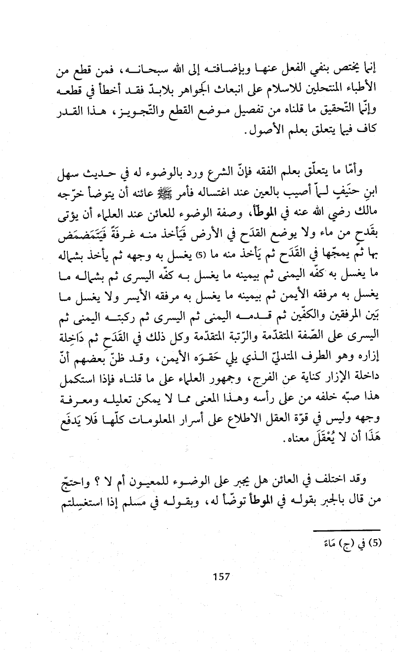 وأمّا ما يتعلّق بعلم الفقه فإنّ الشرع ورد بالوضوء له في حديث سهل ابنِ حنَيفٍ لمّا أصيب بالعين عند اغتساله فأمر - صلى الله عليه وسلم - عائنه أن يتوضأ خرّجه مالك -رضي الله عنه- في الموطأ، وصفة الوضوء للعائن عند العلماء أن يؤتى بقَدحٍ من ماء ولا يوضع القدَح في الأرض فَيَأخذ منه غرفَةً فَيتَمَضمَض بها ثم يمجّها في القَدَح ثم يَأخذ منه ما (¬5) يغسل به وجهه ثم يأخذ بشماله ما يغسل به كفّه اليمنى ثم بيمينه ما يغسل به كفّه اليسرى ثم بشماله ما يغسل به مرفقه الأيمن ثم بيمينه ما يغسل به مرفقه الأيسر ولا يغسل ما بَين المرفقين والكفّين ثم قدمه اليمنى ثم اليسرى ثم ركبته اليمنى ثم اليسرى على الصّفة المتقدّمة والرّتبة المتقدّمة وكل ذلك في القَدَحِ ثم دَاخِلة إزاره وهو الطرف المتدلّي الذي يلي حَقوَه الأيمن، وقد ظنّ بعضهم أنّ داخلة الإزار كناية عن الفرج، وجمهور العلماء على ما قلناه فإذا استكمل هذا صبّه خلفه من على رأسه وهذا المعنى مما لا يمكن تعليله ومعرفة وجهه وليس في قوّة العقل الاطلاع على أسرار المعلومات كلّها فَلا يَدفَع هَذَا أن لا يُعْقَلَ معناه.