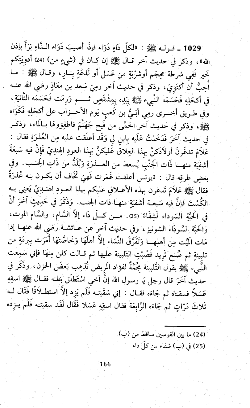 1029 - قوله - صلى الله عليه وسلم -: "لكلّ دَاءٍ دَوَاء فإذَا أصيبَ دَوَاء الدَّاءِ بَرَأَ بإذن الله"، وذكر في حديث آخر قال - صلى الله عليه وسلم - إن كان في (شيءٍ من) (¬24) أدوِيَتكم خَير فَفِي شرطة محِجَم أو شرْبَةٍ من عَسَل أو لَذعَةٍ بِنارٍ، وقال - صلى الله عليه وسلم -: ما أُحِبُّ أن أكتَوِيَ، وذكر في حديث آخر رمِيَ سَعد بن معَاذٍ -رضي الله عنه- في أكحَلِهِ فَحَسَمَه النَّبِيء - صلى الله عليه وسلم - بِيَدِه بِمِشْقَصٍ ثم وَرِمَت فَحَسَمَه الثَّانيَة، وفي طريق أخرى رمِي أبَيُّ بن كَعبٍ يَوم الأحزاب على أكحَلِهِ فكَوَاه - صلى الله عليه وسلم -، وذكر في حديث آخر الحمَّى من فَيح جَهَنَّمَ فاطفِؤوهَا بالَماء، وذكر في حديث آخَرَ فَدَخَلتُ عَلَيه بِابنٍ لي وَقَد أعلَقت عليه مِن العُذرَةِ فقال: عَلاَمَ تدغَرنَ أولاَدَكنَّ بهِذا العِلاق عَليكنَّ بَهِذا العودِ الِهندِيّ فَإِنَّ فيه سَبعَةَ أشفِيَة منها ذَات الَجنْبِ يُسعط من العذرَةِ وَيُلَدُّ من ذَاتِ الَجنب. وفي بعضِ طرقِه قال: "يونس أعلقت غَمَزت فَهيَ تَخَاف أن يكون به عُذرَةٌ فقال - صلى الله عليه وسلم - عَلاَمَ تَدغرن بهذه الأعلاقِ عليكم بهذا العودِ الهندِيّ يَعنِي به الكُسْتَ فإنَّ فيه سَبعة أشفيَةٍ منها ذات الجنب. وَذَكَرَ في حَدِيثٍ آخَرَ أنَّ في الَحبَّةِ السَوداء لَشِفَاءً (¬25). من كلّ دَاء إلاّ السَّام، والسَّام الموت، والحبَّة السَّودَاء الشونيز، وفي حديث آخر عن عائشة -رضي الله عنها- إذا مَات الَميِّت مِن أهلِها وَتَفَرَّقَ النِّسَاء إلاَّ أهلَهَا وَخَاصَّتَهَا أَمَرَت بِبرمَةٍ من تلبينةٍ ئم صُنع ثَرِيد فَصُبّتِ التَلبينة عليها ثم قالت كلن مِنهَا فإني سمِعت النَّبيء - صلى الله عليه وسلم - يقول التَّلبينة مُجِمَّةٌ لفؤاد الَمرِيض تُذهِب بَعضَ الحزن، وذَكَر في حديث آخَرَ قال رجل يَا رسول الله إنَّ أخي اسْتَطلَق بَطنه فقال - صلى الله عليه وسلم - اسقِهِ عَسَلاً فسقاه ثم جَاءَه فقال: إني سَقَيته فَلَم يَزِد إلاَّ استطلاَقًا فَقَال له ثَلاثَ مَرّاتٍ ثم جَاءَه الرَّابِعَة فقال اسقِهِ عَسلا فَقَال لَقَد سقيته فَلَم يزِده