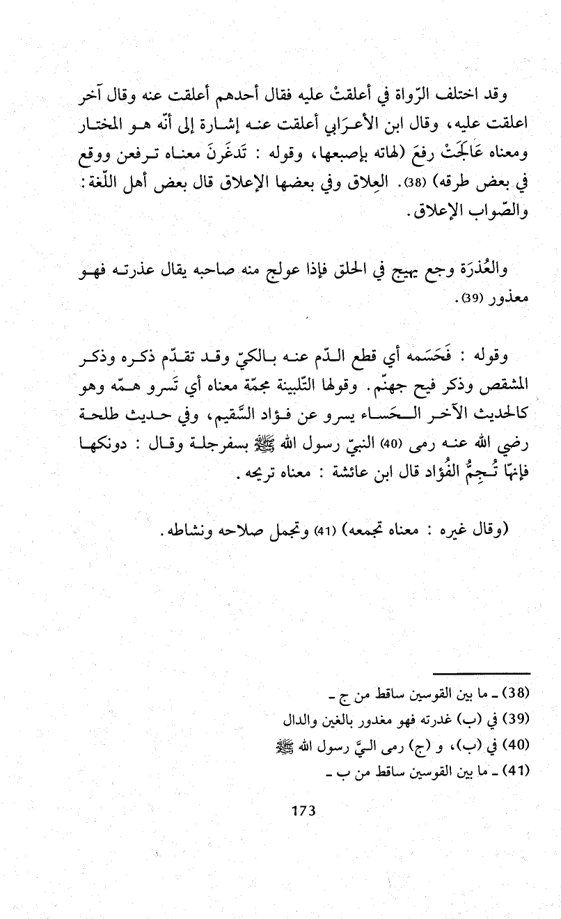 وقد اختلف الرّواة في أعلقتْ عليه فقال أحدهم أعلقت عنه وقال آخر اعلقت عليه، وقال ابن الأعرَابي أعلقت عنه إشارة إلى أنّه هو المختار ومعناه عَالَجَتْ رفعَ (لهاته بإصبعها، وقوله: تَدغَرنَ معناه ترفعن ووقع في بعض طرقه) (¬38). العِلاق وفي بعضها الإعلاق قال بعض أهل اللّغة: والصّواب الإعلاق.