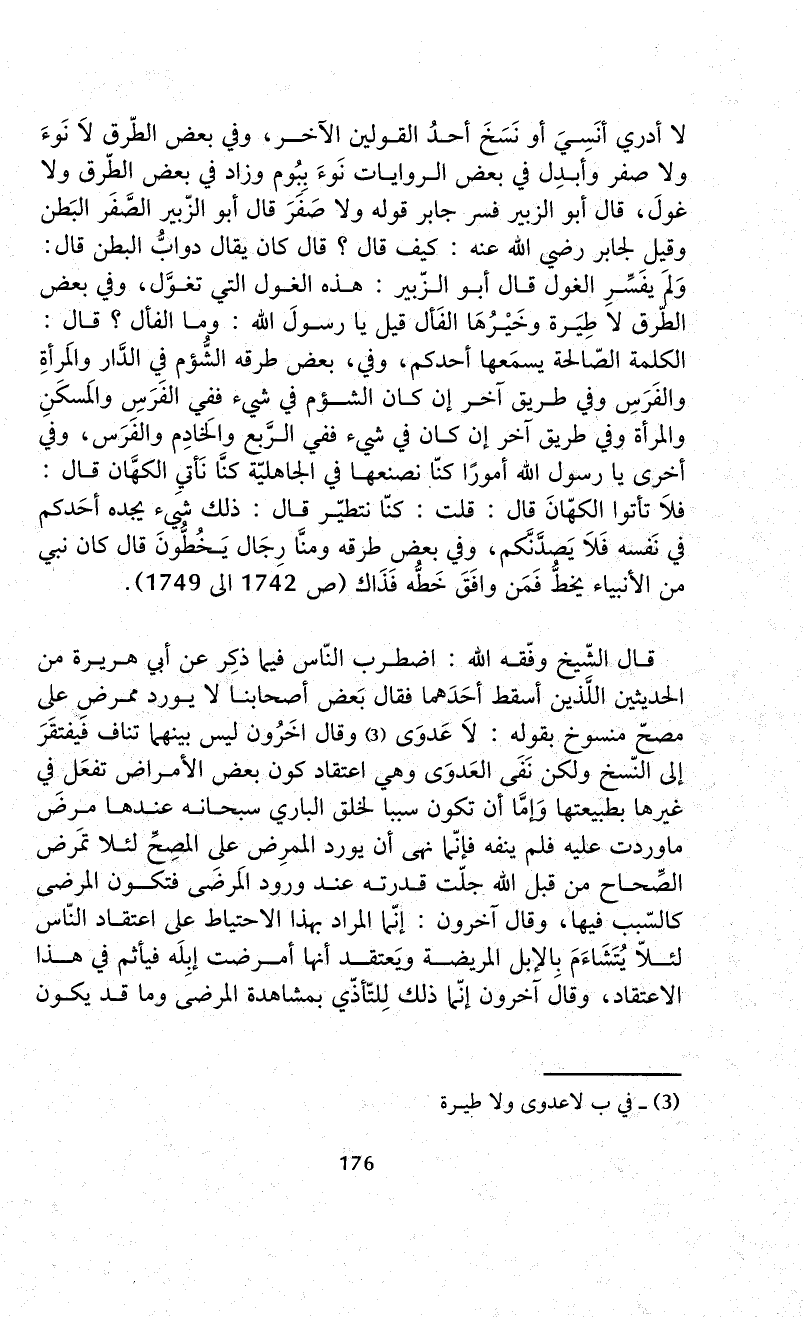 لا أدري أنَسِيَ أو نَسَخَ أحدُ القولين الاَخر، وفي بعض الطّرق لاَ نَوءَ ولا صفر وأبدِل في بعض الروايات نَوءَ بِبُوم وزاد في بعض الطّرق ولا غولَ، قال أبو الزبير فسر جابر قوله ولا صَفَرَ قال أبو الزّبير الصَّفَر البَطن وقيل لجابر -رضي الله عنه-: كيف قال؟ قال كان يقال دوابُّ البطن قال: وَلمَ يفَسِّرِ الغول قال أبو الزّبير: هذه الغول التي تغوَّل، وفي بعض الطّرق لا طِيَرة وخَيْرُهَا الفَأل قيل يا رسولَ الله: وما الفأل؟ قال: الكلمة الصّالحة يسمَعها أحدكم، وفي، بعض طرقه الشُّؤم في الدَّار والَمرأةِ والفَرَسِ وفي طريق آخر إن كان الشؤم في شيء ففي الفَرَسِ والَمسكَنِ والمرأة وفي طريق آخر إن كان في شيء ففي الرَّبع والَخادِم والفَرَس، وفي أخرى يا رسول الله أمورًا كنّا نصنعها في الجاهليّة كنَّا نَأتيِ الكهَّان قال: فلاَ تأتوا الكهّانَ قال: قلت: كنّا نتطيّر قال: ذلك شيء يجده أحَدكم في نَفسه فَلاَ يَصدَّنَّكم، وفي بعض طرقه ومنَّا رِجَال يَخُطُّونَ قال كان نبي من الأنبياء يخطُّ فَمَن وافَقَ خَطُّه فَذَاك (ص 1742 إلى 1749).