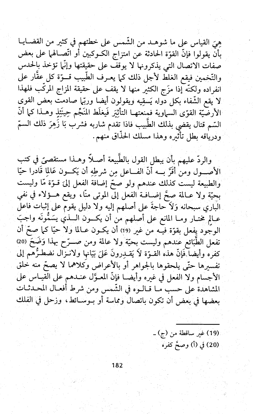 والردّ عليهم بأن يبطل القول بالطَّبيعة أصلاً وهذا مستقصىً في كتب الأصول ومن أقَرَّ به أنّ الفاعل مِن شرطِهِ أن يَكون عَالمِا قَادرا حيّا والطبيعة ليست كذلك عندهم ولو صحّ إضافة الفعل إلىَ قوّة مّا وليست بحيّة ولا عالمة صحَّ إضافة الفعل إلى الموتى منّا، ويقع هؤلاء في نفي الَباري سبحانه وَلاَ حاجةَ على أصلهم إليه ولا دليل يقوم على إثبات فاعل عالمٍ مختار وما المانع على أصلهم من أن يكون الذي يسَمُّونَه واجبَ الوجود يفعل بقوّة فيه من غير (¬19) أن يكون عالما ولا حيّا كما صحّ أن تفعل الطَّبَائع عندهم وليست بحيّة ولا عالمة ومن صرّح بهذا وَضَحَ (¬20) كفره وأيضا فَإنّ هذه القوّة لاَ يَقدِرونَ عَلىَ بَيَانهِا ولانزال نضطرُّهم إلى تفسيرها حتّى يلحقوها بالجواهر أو بالأعراض وكلاهما لا يصحّ منه خلق الأجسام ولا الفعل في غيره وأيضا فإنّ المعوَّل عندهم على القياس على المشاهدة على حسب ما قالوه في الشّمس ومن شرط أفعال المحدثات بعضها في بعض أن تكون باتصال ومماسة أو بوسائط، وزحل في الفلك