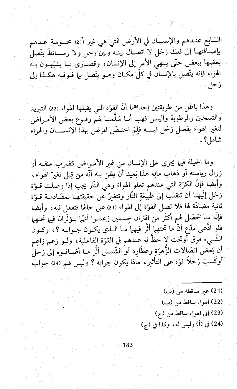 وما الحيلة فيما يجري على الإنسان من غير الأمراض كضرب عنقه أو زوال رياسته أو ذهاب مالِه هذا بَعيد أن يظن به أنّه من قِبل تغيرّ الهواء، وأيضا فإنّ الكرَة التي عندهم تعلو الهواءَ وهي النّار يجب إذا وصلت قوّة زحَل إلَيها أن تنقلب إلى طبيعَةِ النّار وتتغيرّ عن حقيقتها بمصَادمة قوّة ثانية مضادّة لها فلا تصل القوّة إلى الهواء (¬23) على حالها فتفعل فيه، وأيضا فإنّه ما حَصَل لهم أكثَر من اقتران جِسمين زعموا أنهّما يؤثّران فيما تحتهما فلو ادَّعى مدّع أنّ ما تحتهما أثَّر فيهما ما الذي يكون جوابه؟، وكون الشّيء فوق أو تحت لا حظَّ له عندهم في القوّة الفاعلية، ولو زعم زاعِم أن بَعض اتصَالات الزُّهرَةِ وعطَارِد أو الشّمس أثَّر ما أضافوه إلى زحل أو كَسبَ زحلاً قوّة على التَأثير، ماذا يكون جوابه؟ وليس لهم (¬24) جواب