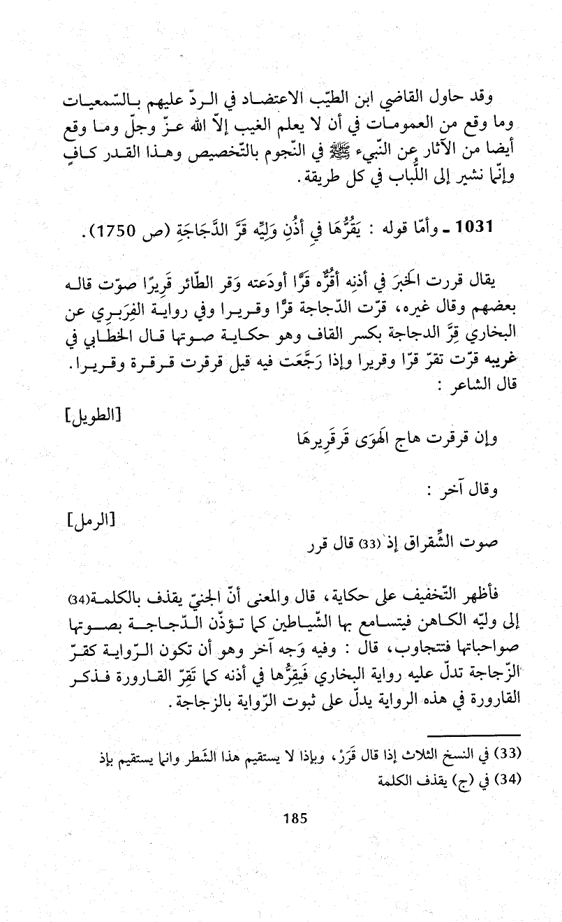 1031 - وأمّا قوله: يَقُرُّهَا فيِ أذُنِ وَلِيِّه قَرَّ الدَّجَاجَةِ (ص 1750).