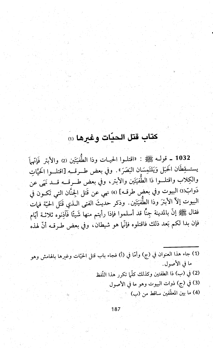 (¬1) جاء هذا العنوان في (ج) وأمّا في (أ) فجاء باب قتل الحيّات وغيرها بالهامش وهو ما في الأصول.