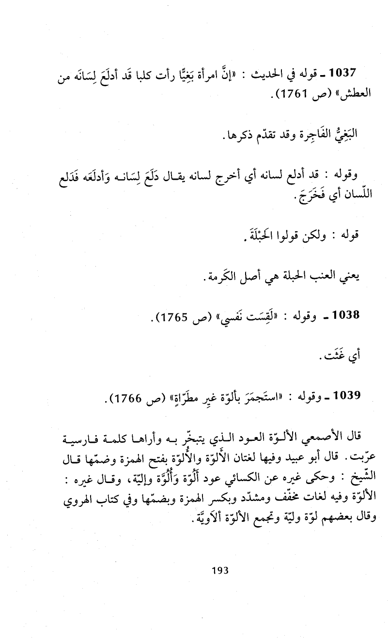 1039 - وقوله: "استَجمَرَ بألوّة غيِر مطَرّاةٍ" (ص 1766).