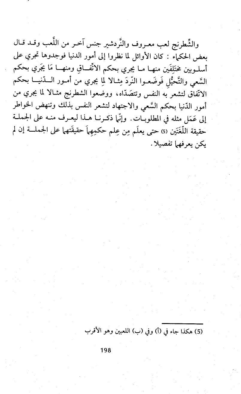 والشِّطرنج لعب معروف والنَّردشير جنس اَخر من اللَّعب وقد قال بعض الحكماء: كان الأوائل لما نظروا إلى أمور الدنيا فوجدوها تجري على أسلوبين مختَلِفَين منها ما يجري بحكم الاتِّفاقِ ومنها مَا يجَري بحكم السَّعي والتَّحيُّلِ فَوضَعوا النّردَ مِثالا لمِا يجري من أمور الدّنيا بحكم الاتّفاق لتشعر به النفس وتتصَدّاه، ووضعوا الشطرنج مثالاً لما يجري من أمور الدّنيا بحكم السَّعي والاجتهاد لتشعر النفس بذلك وتنهض الخواطر إلى عَمَل مثله في المطلوبات. وإنّما ذكرنا هذا ليعرف منه على الجملة حقيقة اللّغَتَين (¬5) حتى يعلَم مِن عِلم حكمِهِماَ حقيقَتهما على الجملة إن لم يكن يعرفهما تفصيلاً.