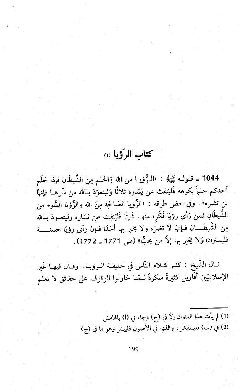 1044 - قوله - صلى الله عليه وسلم -: "الرُّؤيا من الله وَالحلم مِن الشَّيطَان فإذا حَلَم أحدكم حلماً يكرهه فَليَنفث عن يَسَاره ثلاثًا وَليتعوّذ بالله من شّرها فإنهّا لن تضره". وفي بعض طرقه: "الرُّؤيا الصَالحِة مِنَ الله والرُّؤيَا السّوء من الشَّيطَانِ فمن رَأى رؤيَا فكَرِه منها شَيئًا فَليَنفِث عن يَسَاره وليتعوذ بالله مِن الشَّيطان فإنهّا لا تضرّه ولا يخبر بها أحَدًا فإن رأى رؤيَا حسنة فليستر (¬2) وَلا يخبر بها إلاّ من يحبُّ" (ص 1771 - 1772).