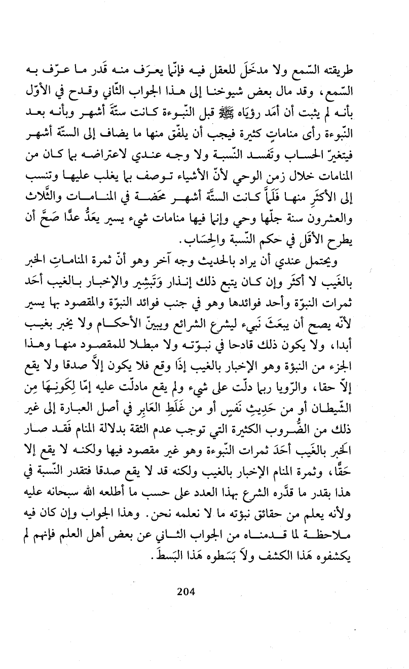 طريقته السّمع ولا مدخَلَ للعقل فيه فإنّما يعرَف منه قَدر ما عرّف به السّمع، وقد مال بعض شيوخنا إلى هذا الجواب الثّاني وقدح في الأوّل بأنه لم يثبت أن أمَد رؤيَاه - صلى الله عليه وسلم - قبل النّبوءة كانت ستّةَ أشهر وبأنه بعد النّبوءة رأى مناماتٍ كثيرة فيجب أن يلفّق منها ما يضاف إلى الستّة أشهر فيتغيرّ الحساب وتَفسد النّسبة ولا وجه عندي لاعتراضه بما كان من المنامات خلال زمن الوحي لأنّ الأشياء توصف بما يغلب عليها وتنسب إلى الأكثَرِ منها فَلَماَّ كانت الستَّة أشهر محَضة في المنامات والثَّلاث والعشرون سنة جلّها وحي وإنما فيها منامات شيء يسير يعَدُّ عدًّا صَحَّ أن يطرح الأقَل في حكم النّسبة والِحسَاب.