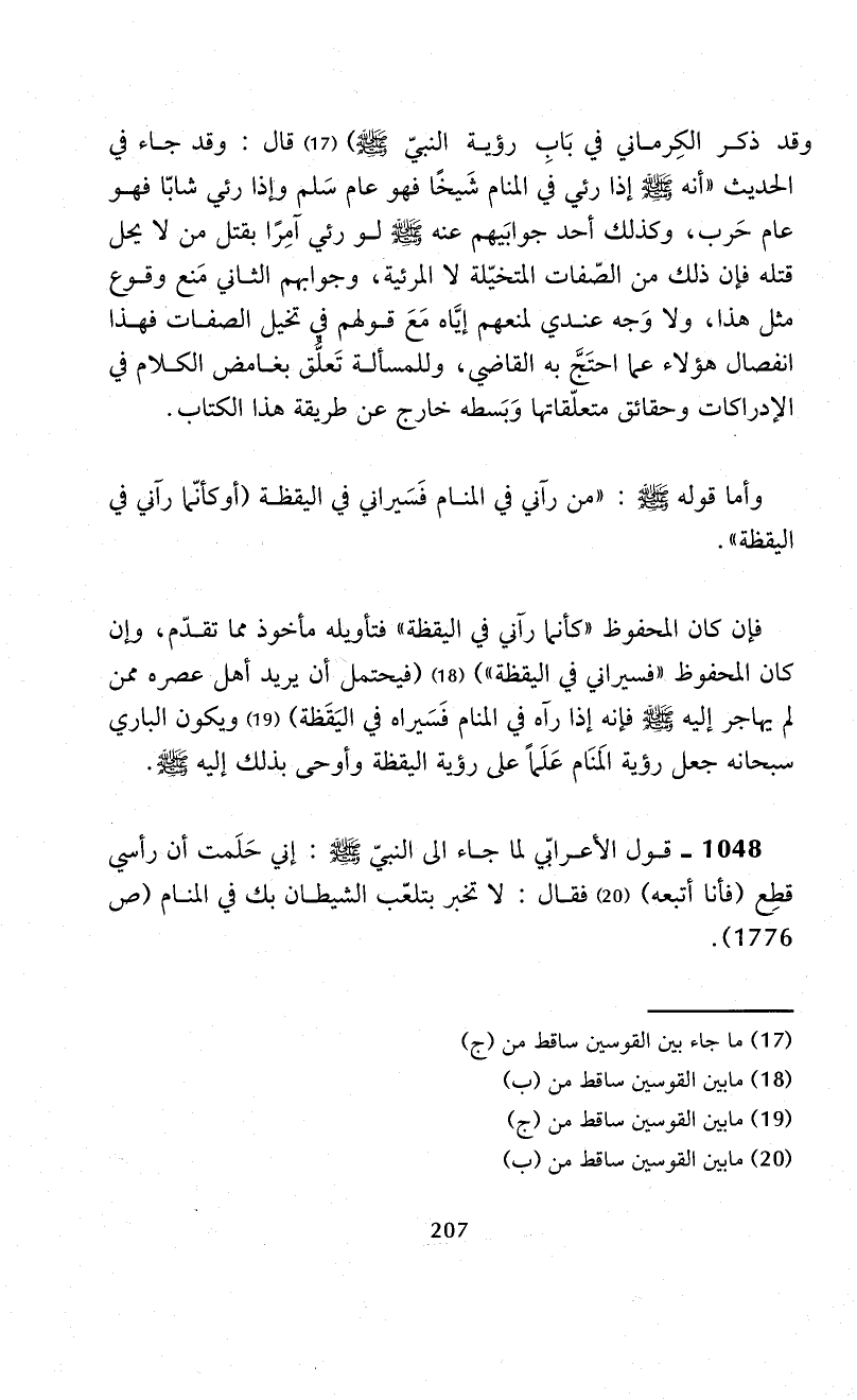 وقد ذكر الكِرماني في بَابِ رؤية النبيّ - صلى الله عليه وسلم - (¬17) قال: وقد جاء في الحديث "أنه - صلى الله عليه وسلم - إذا رئي في المنام شَيخًا فهو عام سَلم وإذا رئي شابّا فهو عام حَرب، وكذلك أحد جوابَيهم عنه - صلى الله عليه وسلم - لو رئي آمِرًا بقتل من لا يحل قتله فإن ذلك من الصّفات المتخيّلة لا المرئية، وجوابهم الثاني مَنع وقوع مثل هذا، ولا وَجه عندي لمنعهم إيَّاه مَعَ قولهم في تخيل الصفات فهذا انفصال هؤلاء عما احتَجَّ به القاضي، وللمسألة تَعلّق بغامض الكلام في الإدراكات وحقائق متعلّقاتها وَبَسطه خارج عن طريقة هذا الكتاب.