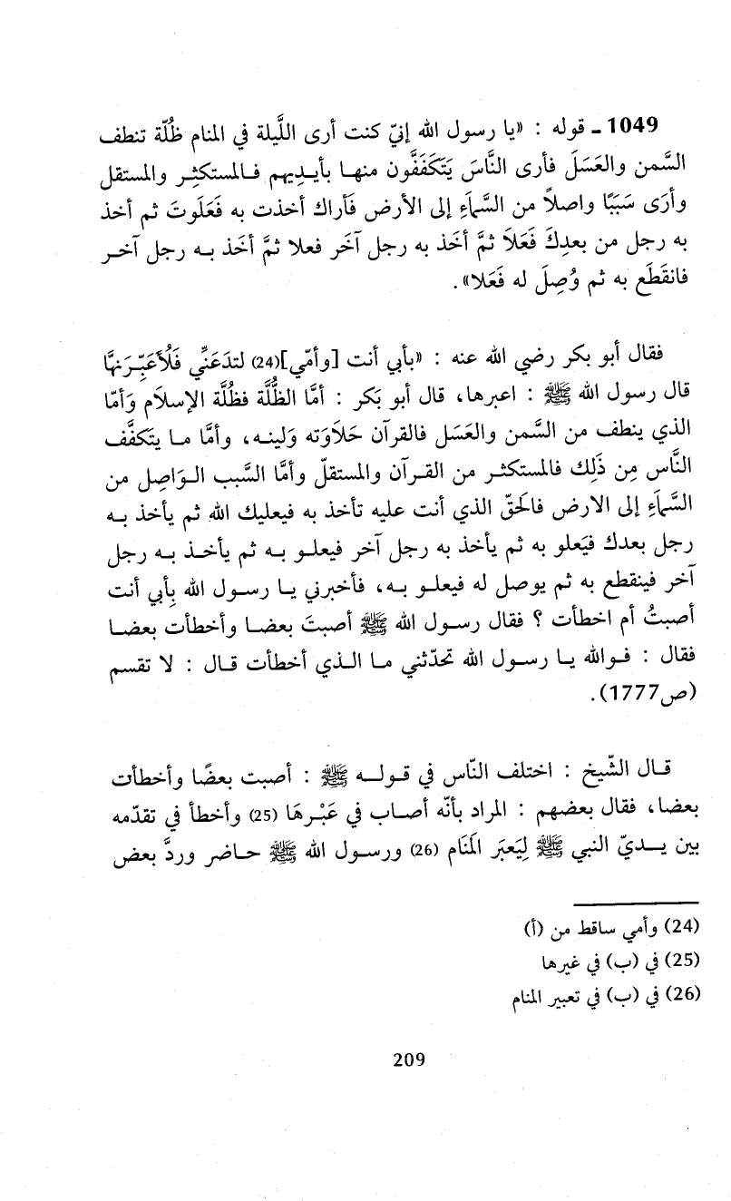 قال الشّيخ: اختلف النّاس في قوله - صلى الله عليه وسلم -: أصبت بعضًا وأخطأت بعضا، فقال بعضهم: المراد بأنّه أصاب في عَبْرهَا (¬25) وأخطأ في تقدّمه بين يديّ النبي - صلى الله عليه وسلم - لِيَعبَر الَمنَام (¬26) ورسول الله - صلى الله عليه وسلم - حاضر وردَّ بعض