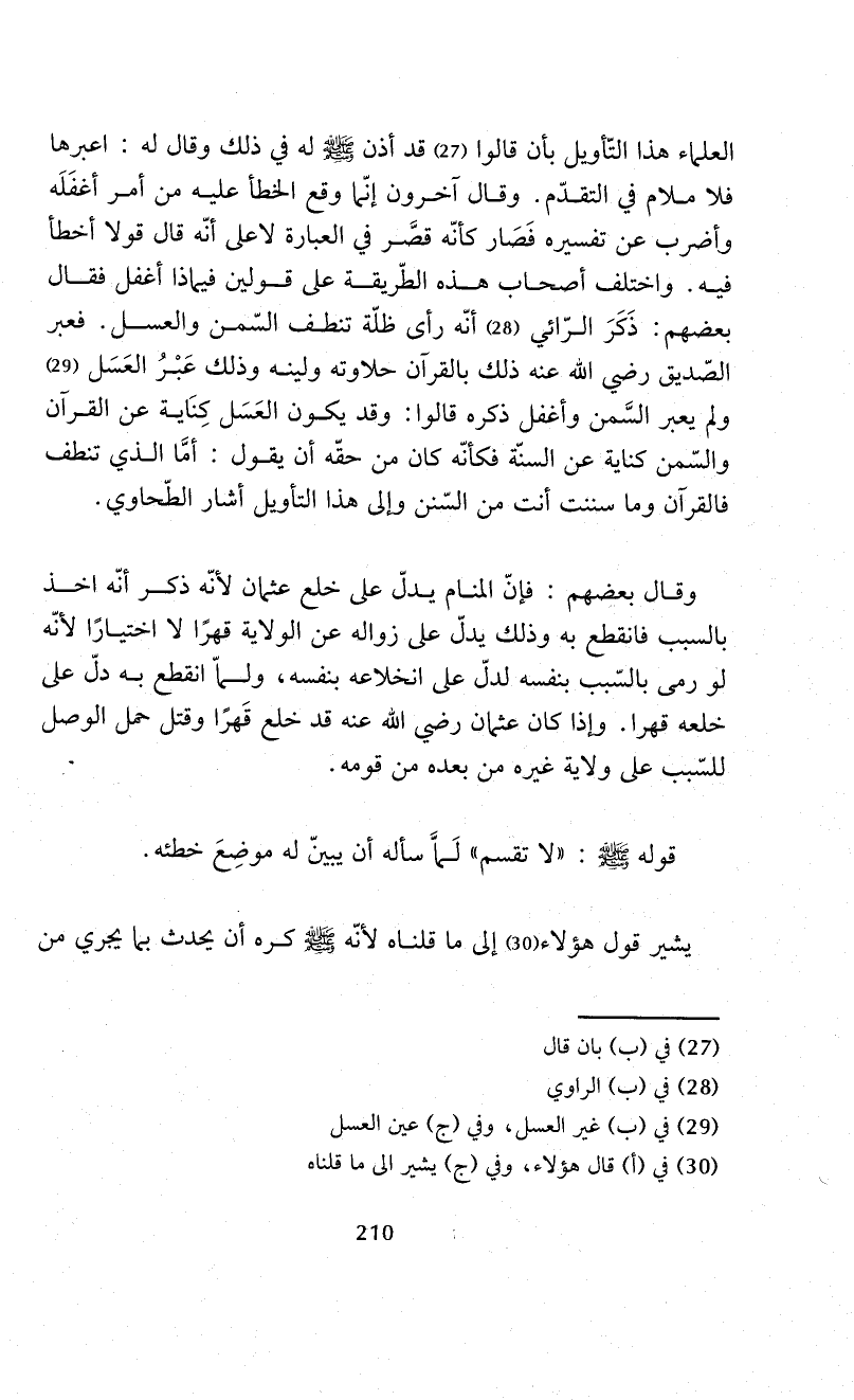 العلماء هذا التّأويل بأن قالوا (¬27) قد أذن - صلى الله عليه وسلم - له في ذلك وقال له: اعبرها فلا ملام في التقدّم. وقال آخرون إنّما وقع الخطأ عليه من أمر أغفَلَه وأضرب عن تفسيره فَصَار كأنّه قصَّر في العبارة لاعلى أنّه قال قولا أخطأ فيه. واختلف أصحاب هذه الطّريقة على قولين فيماذا أغفل فقال بعضهم: ذَكَرَ الرّائي (¬28) أنّه رأى ظلّة تنطف السّمن والعسل. فعبر الصّديق -رضي الله عنه- ذلك بالقرآن حلاوته ولينه وذلك عَبْرُ العَسَل (¬29) ولم يعبر السَّمن وأغفل ذكره قالوا: وقد يكون العَسَل كِنَاية عن القرآن والسّمن كناية عن السنّة فكأنّه كان من حقّه أن يقول: أمَّا الذي تنطف فالقرآن وما سننت أنت من السّنن وإلى هذا التأويل أشار الطّحاوي.