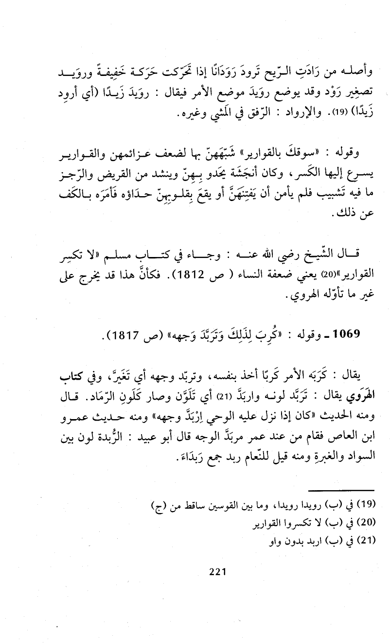 قال الشّيخ -رضي الله عنه-: وجاء في كتاب مسلم "لا تكسِر القوارير" (¬20) يعني ضعفة النساء (ص 1812). فكأنَّ هذا قد يخرج على غير ما تأوّله الهروي.