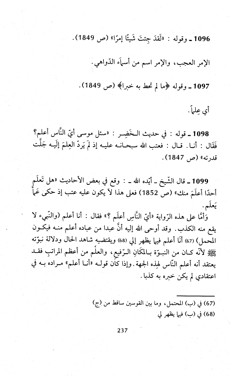 1098 - قوله: في حديث الخَضِر: "سئل موسى أيّ النَّاس أعلم؟ فَقَال: أنا. قال: فعتب الله سبحانه عليه إذ لمَ يَردّ العِلمَ إلَيه جَلَّت قدرته" (ص 1847).